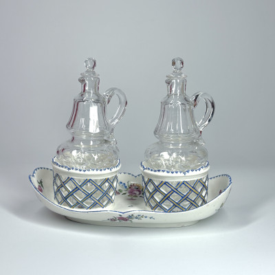 Mennecy soft-paste porcelain oil cruet holder, openwork shape on a contoured, attached tray, with cut glass cruets and stoppers. Polychrome floral decoration. Blue lacework on the rims.