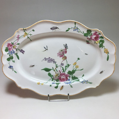 Large oval dish with a rounded edge in Marseille earthenware with an off-center polychrome decoration in the middle of a large bouquet of flowers, it is surrounded by many insects and two flowering branches on the wing and the fall, yellow mesh on the edge. Robert factory - Eighteenth century - Around 1765-1770 - Long: 45.5cm