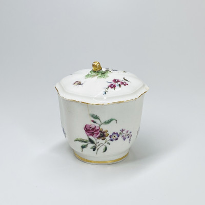 Vincennes, Covered sugar pot in soft porcelain called lizonné sugar pot with polychrome decoration of flowers and insects, the grip of the lid in the shape of an acorn, gold fiet on the edges - Eighteenth century, circa 1752