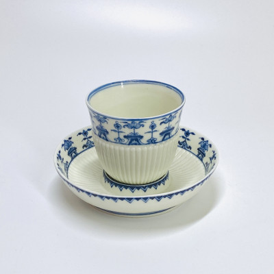 Goblet and its saucer in soft Saint-Cloud porcelain with relief gadroons, the gallery saucer, decorated in blue shades