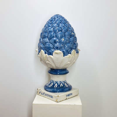Large Porto earthenware pine cone decorated in blue shades, decorative element of outdoor architecture. Marked on the base: Fª de Stº António, Porto - Santo Antonio factory in Vale da Piedade. Nineteenth century