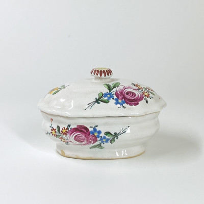 Covered spice box in earthenware from Holics (Hungary) with polychrome decoration of flowers in small fire, the grip of the lid in the shape of a flower - Eighteenth century - Marked.