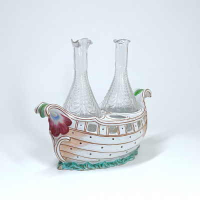 Strasbourg earthenware cruet stand in the shape of a boat with polychrome decoration. Bearing on the top the arms of Louis-Auguste de Bourbon,