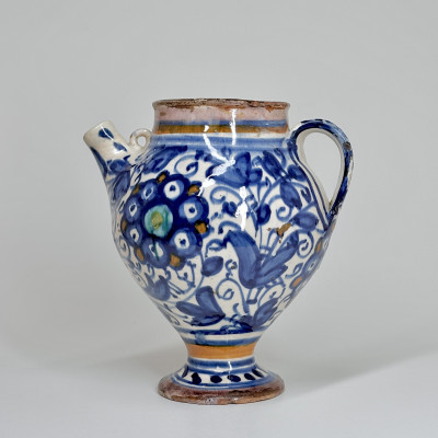 Ovoid-shaped Lyon majolica pharmacy jar on a pedestal with a flat handle, decorated in polychrome with rosettes on a background of blue foliage scrolls, ochre, blue and manganese borders - First half of the sixteenth century - Label from the Brunet collection.