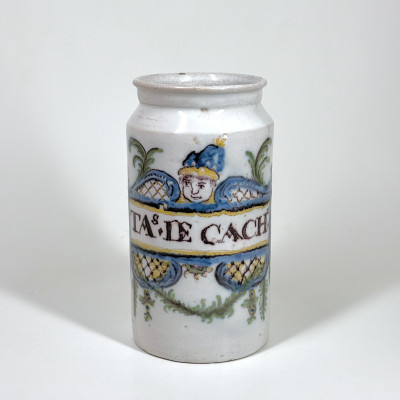 Bordeaux earthenware pharmacy jar of cylindrical shape with a polychrome decoration of the inscription "TAs.DE CACHu" in a band surrounded by the face of a man wearing a cap, reserves at the bottom of a trellis framed by scrolls and foliage - Eighteenth century