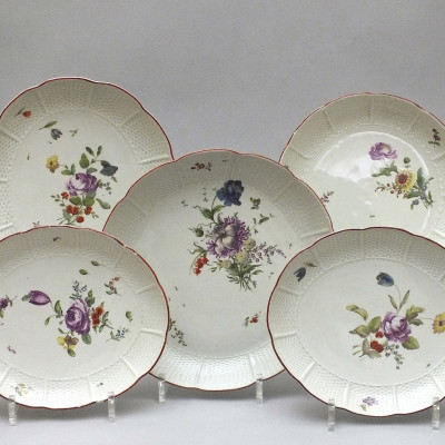 5 cups and small dishes in Ludwigsburg German porcelain decorated with bouquets of multicolored flowers border to relief basketry decor - Brand two CC crowned on each - Eighteenth Century