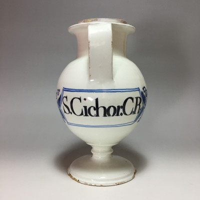 Montpellier - Chevrette of pharmacy with flat handle with decoration in blue camaïeu, inscription in manganese: "S. Cichor.CR. "In a sign placed under the handle - Early eighteenth century.