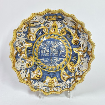 Coupe sur piédouche dite crespina en majolique de Deruta de forme godronnée à décor au centre en camaïeu bleu de batîsses dans un cartouche, entouré de motif polychrome à raffaellesche, cercles concentriques en bleu et jaune au revers - XVIIe siècle