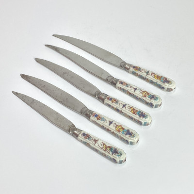 Cinq couteaux en porcelaine tendre de Villeroy-Mennecy à décor polychrome de Chinois debout sur des consoles et branchages fleuris. Virole en argent, lames en acier. Sur une virole poinçon de décharge Paris 1738-1745 (Tête de renard) Saint Cloud, vers 1740 - La Manufacture de Villeroy-Mennecy fut fondée en 1735 par François Barbin (1689-1765), fabricant de porcelaine tendre anciennement installé à Paris, sous la protection de Louis François Anne de Neufville, Duc de Villeroy.