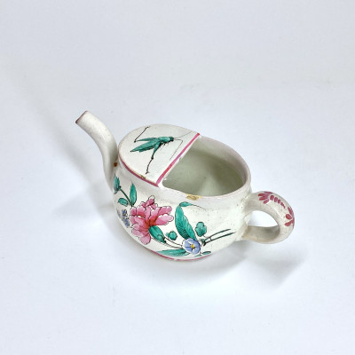Canard de malade en faïence de Moustiers à décor polychrome de fleurs de chaque côté et d’une sauterelle sur le dessus - XVIIIe siècle