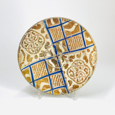 Petit plat en céramique hispano-mauresque à bord uni et ombilic au centre, à décor de lustre métallique jaune chamois, traits en bleu divisent le décor en quatre registres à motifs géométriques, revers décoré de filets concentriques - Espagne - Aragon ou Catalogne XVIe Siècle - Oeuvre en rapport: Londres - Victoria and Albert Muséum 387-1893 - Paris - Musée de Cluny CL.9321