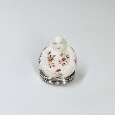 Saint-Cloud - Charmante petite boîte couverte figurant un Bouddha assis les mains sur le ventre, décoré en polychromie de branchages de fleurs dans le style Kakiemon.