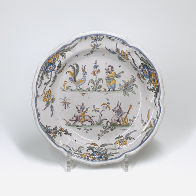 Assiette en faïence de Lyon à bord contourné à décor polychrome de grotesques disposées sur deux registres sur des tertres fleuris, bordure décorés de branchages fleuris, filets bleus sur le pourtour. XVIIIe siècle