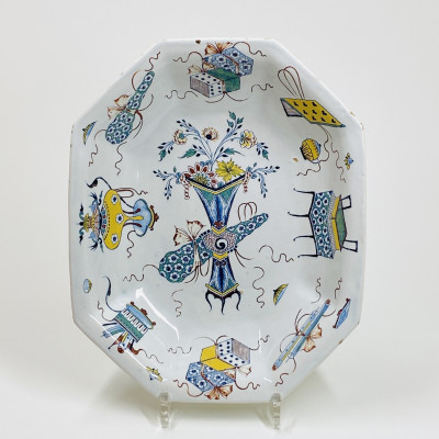 Plat de forme octogonal en faïence polychrome de Rouen à décor dit "à l’échantillon". Au centre d'un vase fleuri, sur l'aile et la chute des motifs taoïstes : pot à pinceaux, rouleaux, brule-parfum et objets de lettrés XVIIIe siècle