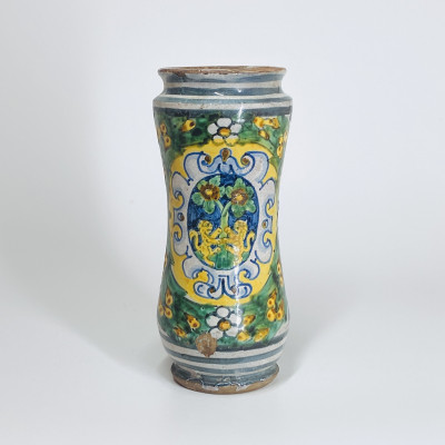 Albarello en majolique de Trapani en Sicile, légèrement cintré à décor polychrome d’un écu dans un cartouche formé de motifs de cuir découpé entouré d'une couronne de laurier et de fleurs - XVIIe siècle