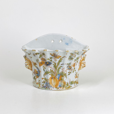 Bouquetière d'applique en faïence de Lyon à décor polychrome de citrouilles au pied de larges branchages fleuris et d'une autruche, les anses en forme de mascarons - XVIIIe siècle.