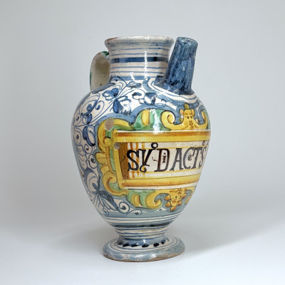Chevrette en majolique de Montelupo à décor polychrome d'une inscription pharmaceutique dans un bandeau sur fond de feuillage en camaïeu bleu - XVIIe siècle