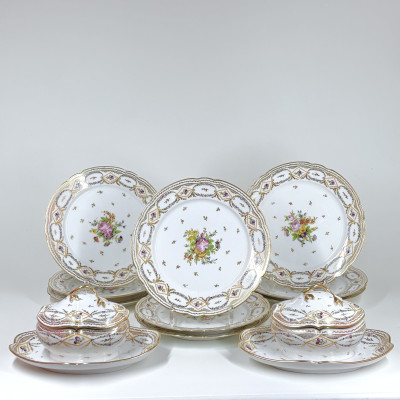 Suite de neuf assiettes à bord contourné en porcelaine de Bordeaux à décor polychrome et or d'un bouquet de fleurs au centre entouré de brindilles dorées et sur l'aile de guirlandes de fleurs alternées de petits losanges en jaune contenant une pensée. Cet ensemble est complété d'une paire de sucriers à plateau adhérent très probablement décorés à Bordeaux, la qualité de la peinture étant identique à nos assiettes, ces deux sucriers sont en porcelaine de Paris de la manufacture de Locré.