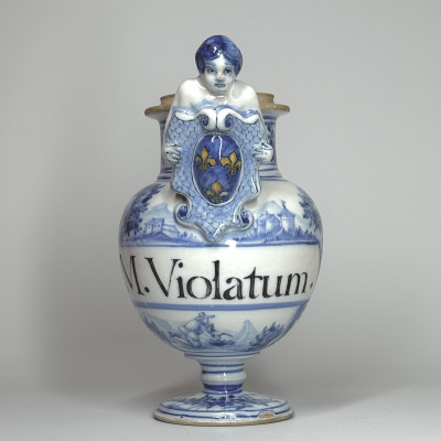 Décor d'un écriteau avec l'inscription en manganèse "M. Violatum." Sur fond de paysage animé. Remarquez sous le phylactère ce petit personnage agenouillé fauchant les herbes ou des violettes ? Fleurs et insectes sur le col et la base.