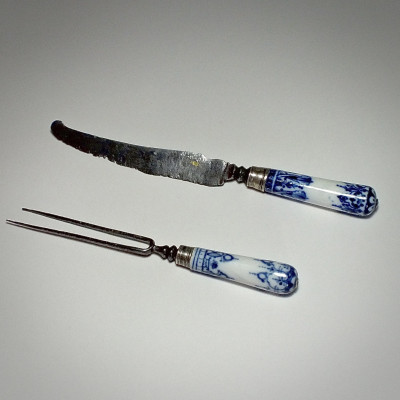 Un couteau et une fourchette en porcelaine tendre de Saint-Cloud décorés en camaïeu bleu de lambrequins.