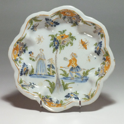 LYON Beau drageoir à huit lobes à décor polychrome en plein d'une scéne galante présentant deux personnages, la femme tenant un bouquet de fleurs, l'homme tenant une pique à la main lui amenant un message, séparé par un arbre au milieu. La scéne entourée de papillon, insecte et fleurs sur les bords. Filets jaune sur le bord - XVIIIe siècle - Drageoir proche, la faïence de Lyon - Deloche - 1994.