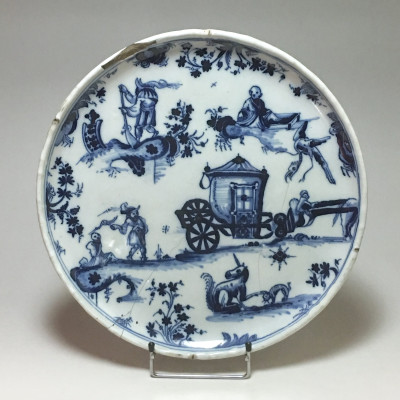 Plateau sur piedouche en faïence de Lyon décoré en camaïeu bleu d'un amusant décor de diverses grotesques, singe conduisant un carrosse, d'une licorne carressant un chat, bossu tenant un fusil etc... XVIIIe siècle.