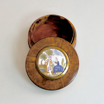 Rare boîte de forme circulaire en buis ornée d'une plaque en faïence de Moustiers à décor de grand feu polychrome figurant un couple jouant de la musique sur fond de paysage. L'intérieur en écaille - Deuxième moitié du XVIIIe siècle - Les boîtes en buis était une spécialité d'Aiguines, village situé à quelques kilomètres de Moustiers.