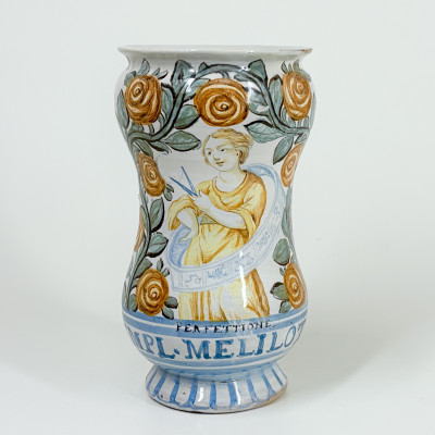 Albarello en majolique de Castelli, de forme cintré à décor polychrome figurant l'allégorie de la perfection sous les traits d'une jeune femme tenant un compas et entouré des symboles du zodiaque dans un encadrement de roses, surmontant l'inscription "perfettione" et l'inscription pharmaceutique "Empl. Melilot." - Fin du XVIIe siècle